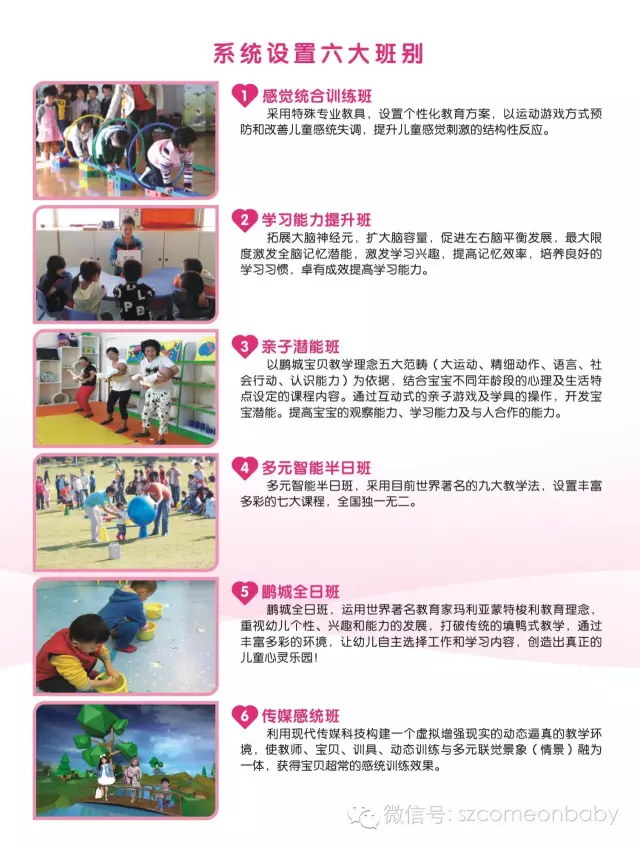 鵬城寶貝系統(tǒng)設(shè)置三大系列六大課程,專業(yè)針對半歲至12歲的寶貝,微信平臺回復(fù):寶寶姓名+性別+年齡+聯(lián)系電話,即可在線預(yù)約體驗課或感統(tǒng)測評喲!